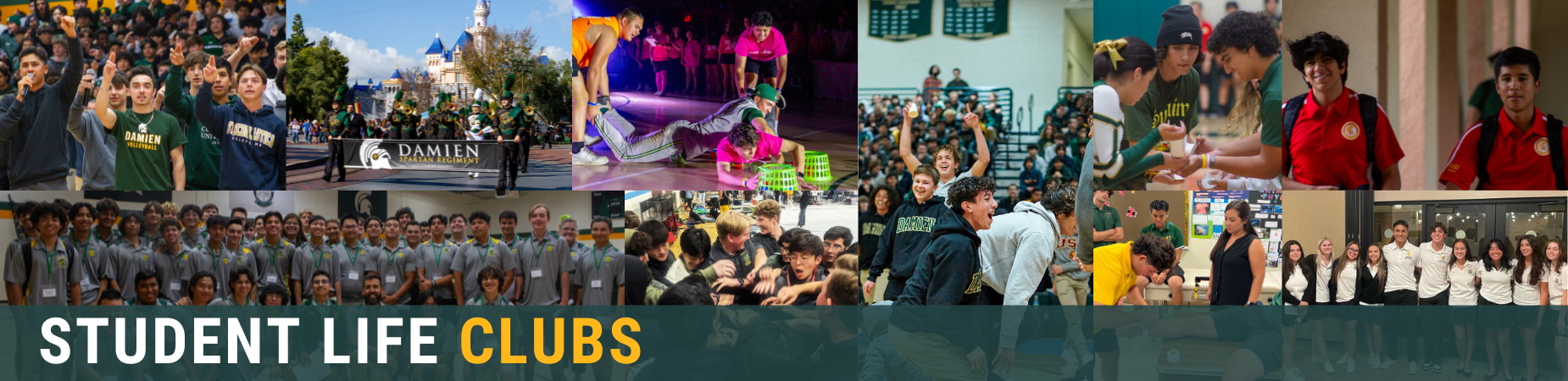 At Damien High School, student clubs play a vital role in shaping a well rounded and engaging campus experience. With more than forty active clubs – and the opportunity for students to create their own – our offerings allow every Spartan to pursue academic interests, explore social justice initiatives, participate in service, discover new hobbies, and connect with peers who share similar passions. These clubs enrich daily life on campus, strengthen our sense of community, and encourage students to grow as leaders, deepen their faith, and contribute meaningfully to the life of the school.
